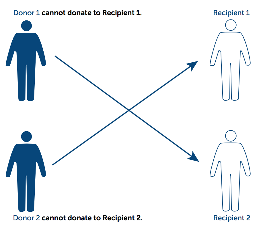 The ANZKX programme works by finding compatible donors and recipients. Look at this diagram. Donor 1 cannot donate to Recipient 1. Nor can Donor 2 donate to Recipient 2. But Donor 1 is compatible with and can donate to Recipient 2. And Donor 2 is compatable with and can donate to Recipient 1. By taking part in the ANZKX programme both recipients can have a live donor kidney transplant. Sometimes the ANZKX could be more involved and might involve more than two pairs and possibly a non-directed donor.